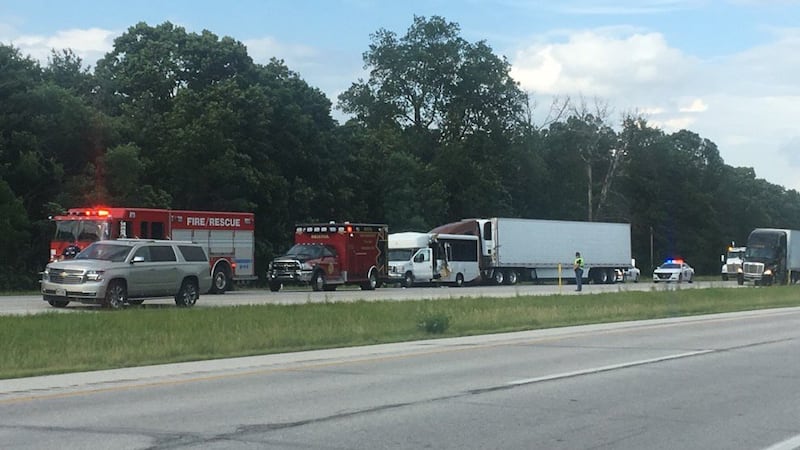 The crash involved a passenger bus and two semis. It happened at the 95.2 mile marker in the westbound lanes.