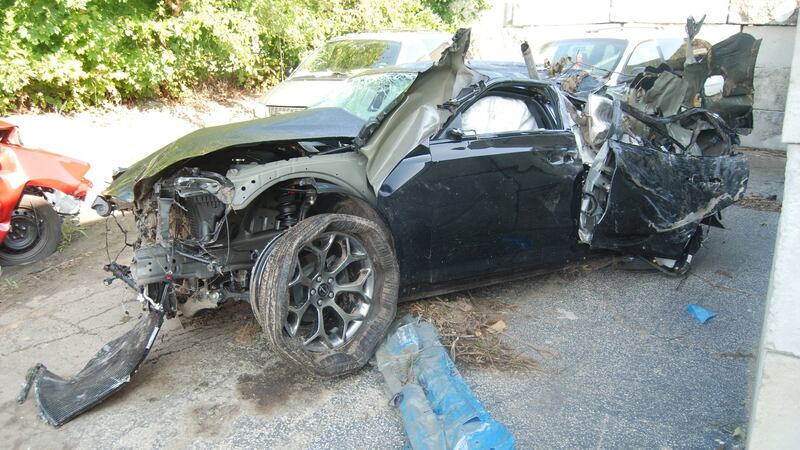 The vehicle became airborne at the intersection of Division Road and entered the woods on the west side of the road. The car damaged several trees, and parts of the vehicle were littered throughout the area.