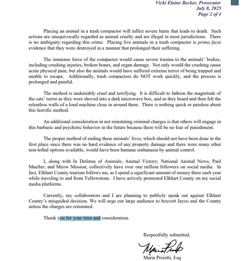 Maria Proietti says in the letter that putting the cats in a trash compactor caused the cats suffering and significant pain.